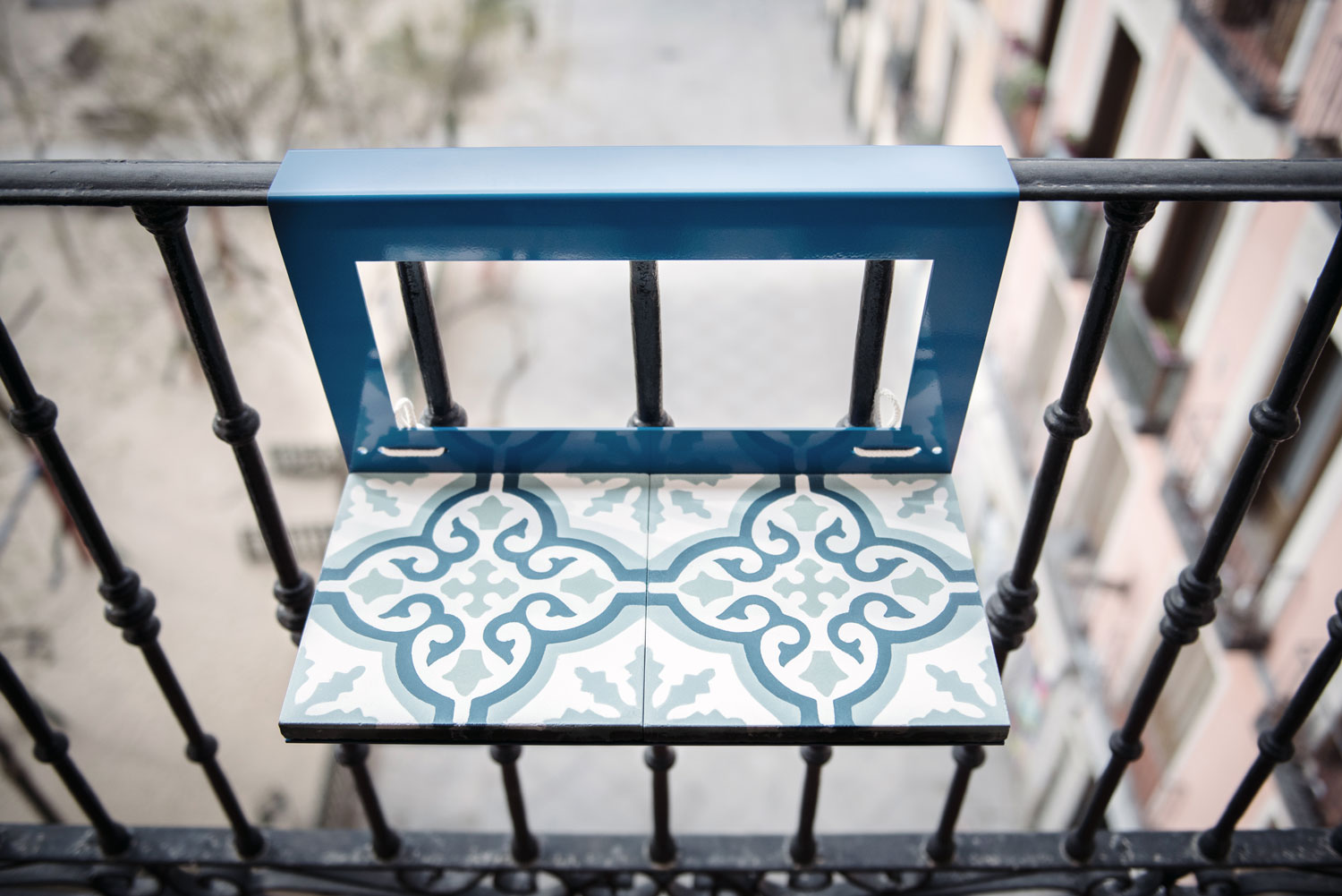 MANUELA es la mesita para todos los balcones. No tiene patas, no necesita instalación. Solo se apoya a la barandilla de tu balcón. Lista para usar en los días soleados.