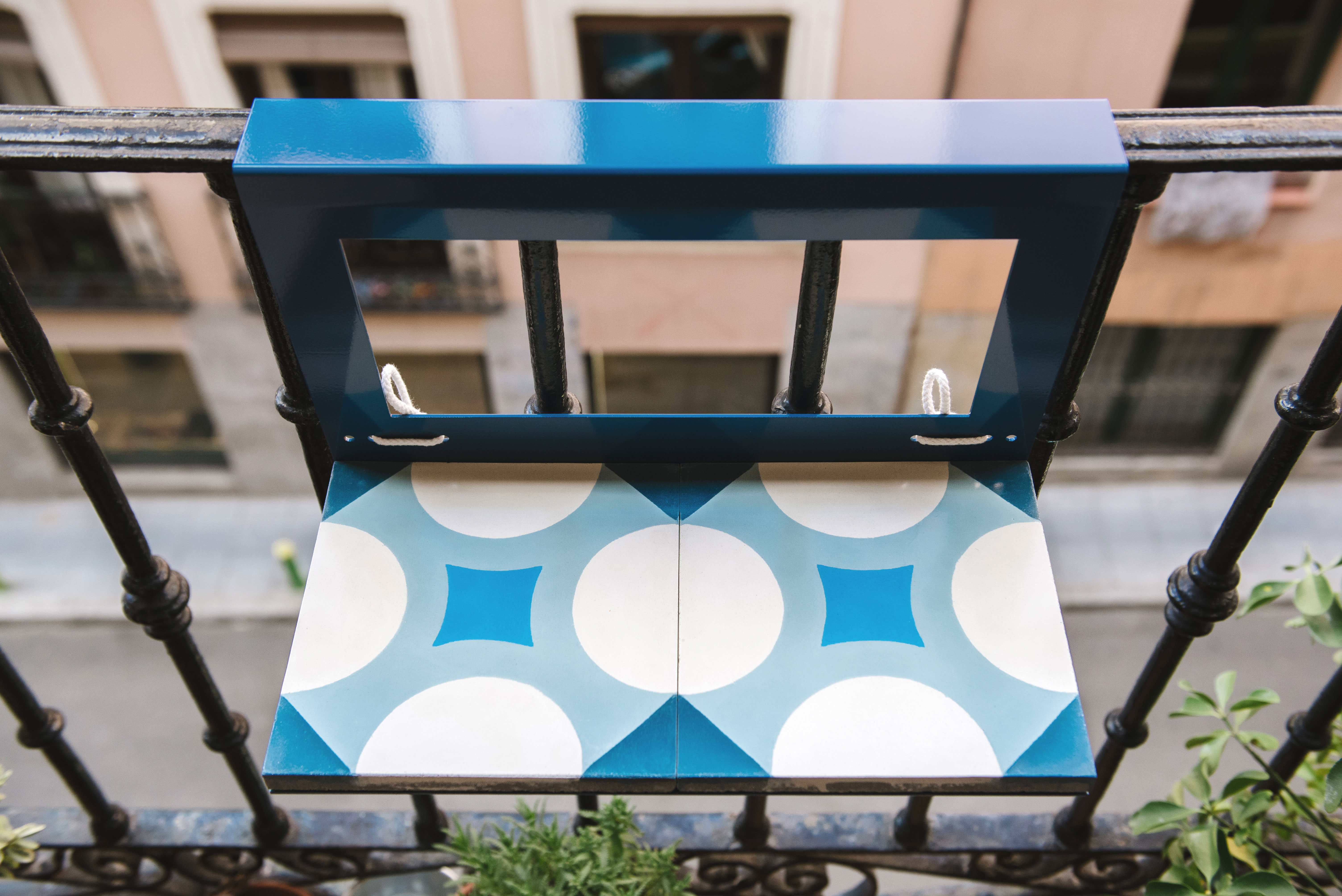 MANUELA es una pieza de acero plegado de 2,5mm que se adapta perfectamente al pasamanos de la barandilla con hasta 5cm de ancho (1,95inches). La superficie horizontal de 40x20cm está resuelta con dos baldosas hidráulicas fabricadas a mano.