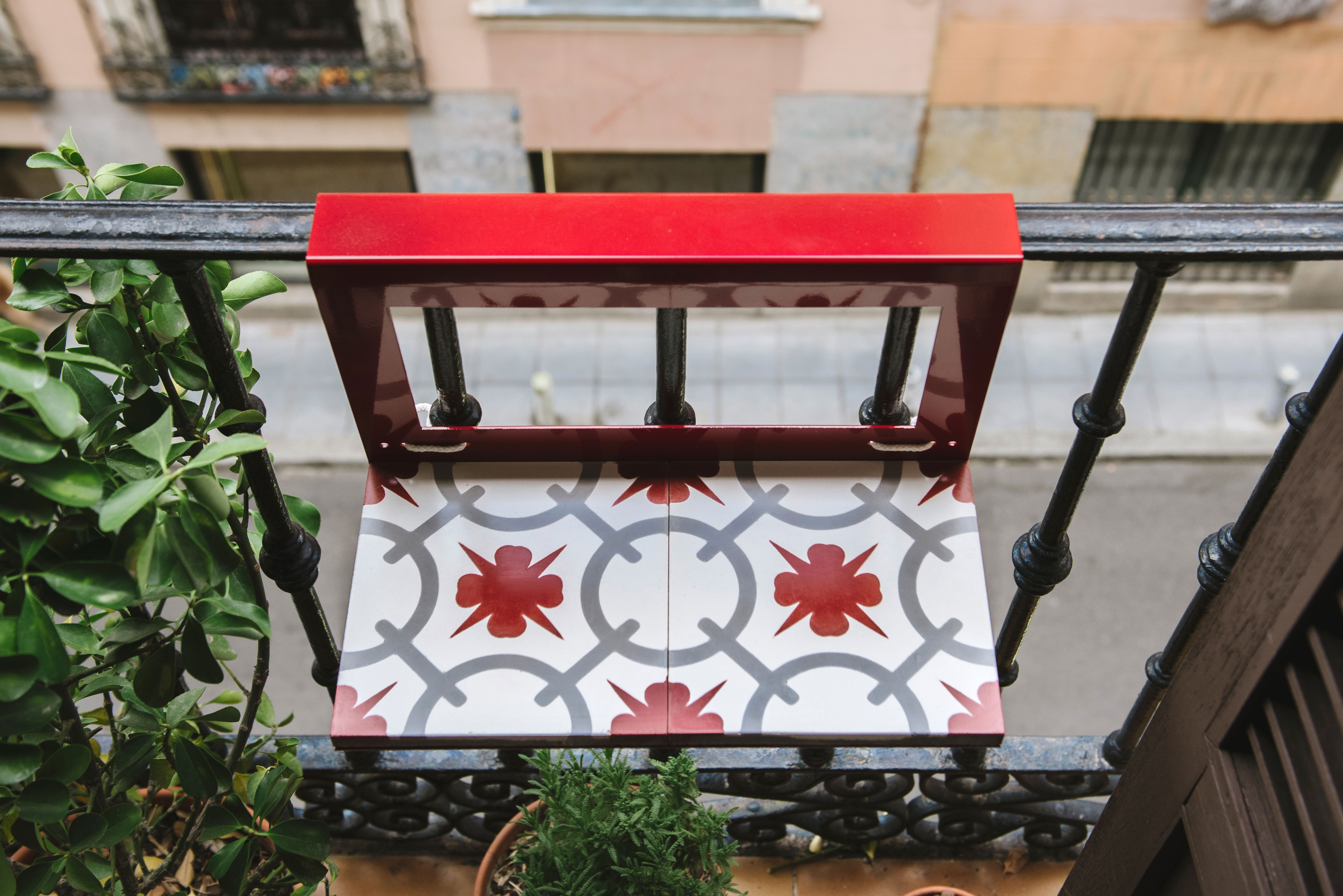 MANUELA es una pieza de acero plegado de 2,5mm que se adapta perfectamente al pasamanos de la barandilla con hasta 5cm de ancho (1,95inches). La superficie horizontal de 40x20cm está resuelta con dos baldosas hidráulicas fabricadas a mano.