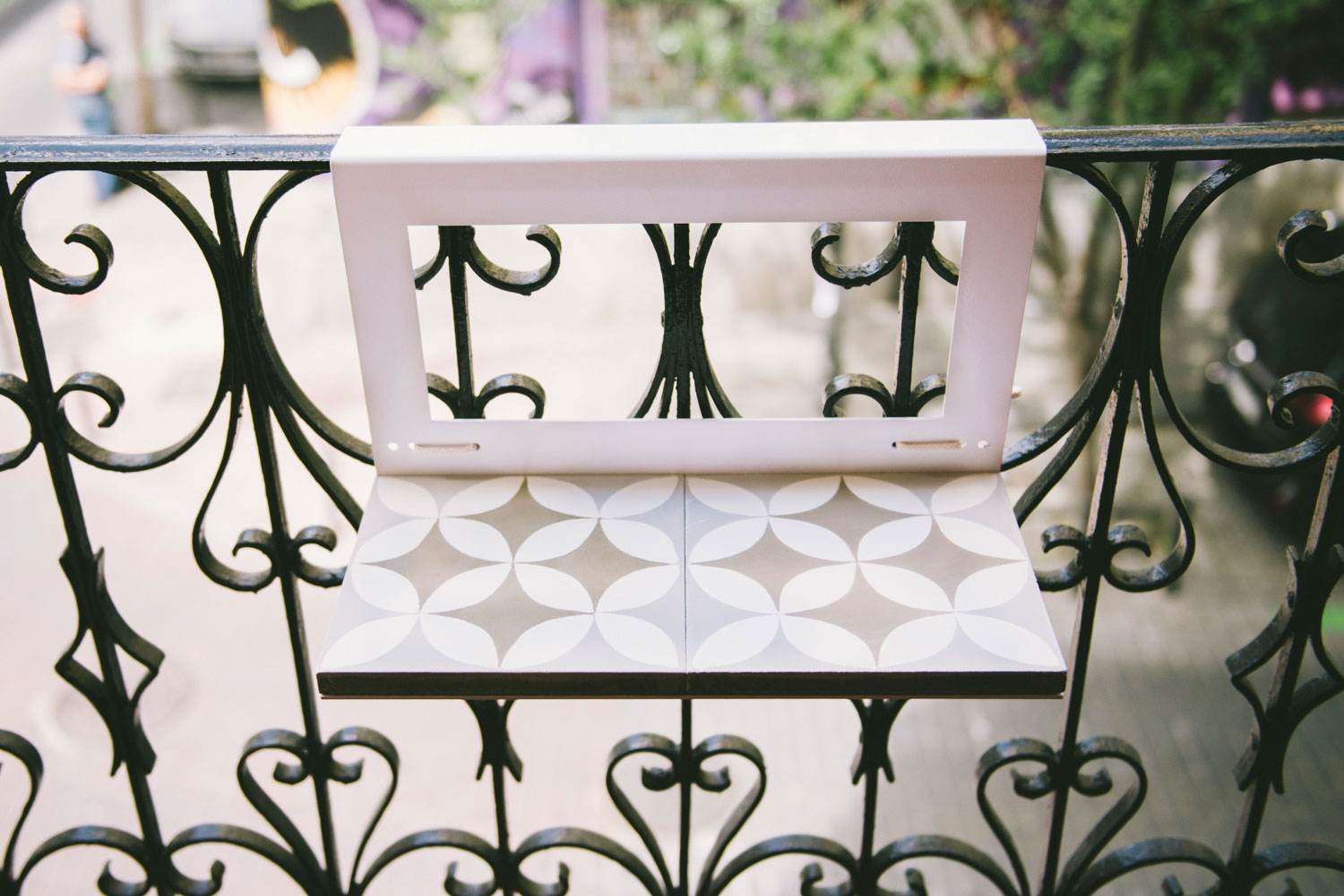 MANUELA es la mesita para los balcones de todas partes. No tiene patas, no necesita instalación. Solo se apoya a la barandilla de tu balcón. Lista para usar en los días soleados.